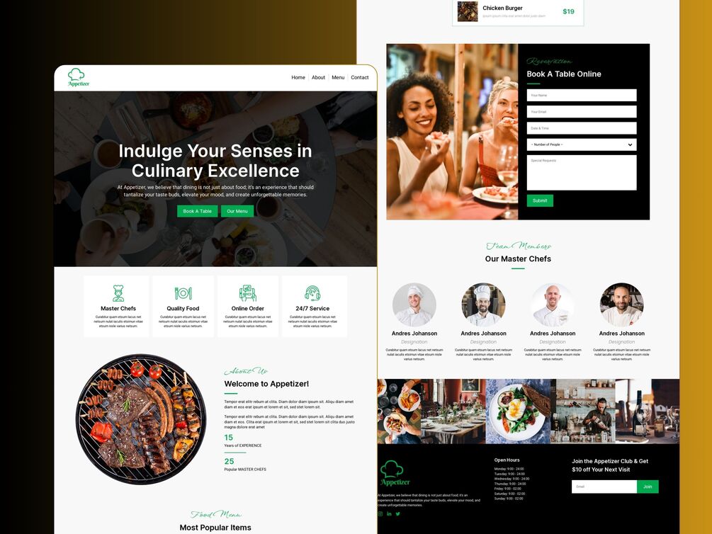 With our Restaurant Website Template, you're not just creating a website – you're crafting a delectable online experience that drives traffic, reservations, and orders. Whether you're a fine dining establishment or a cozy neighborhood bistro, this template will help you tantalize taste buds and fill seats.